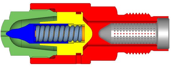 Duza compactă cu supapă tip ac cu arc cu filtru împiedică scurgerea de material plastic după terminarea procesului de injecţie, în timp ce impurităţile din granule sunt captate în filtru.