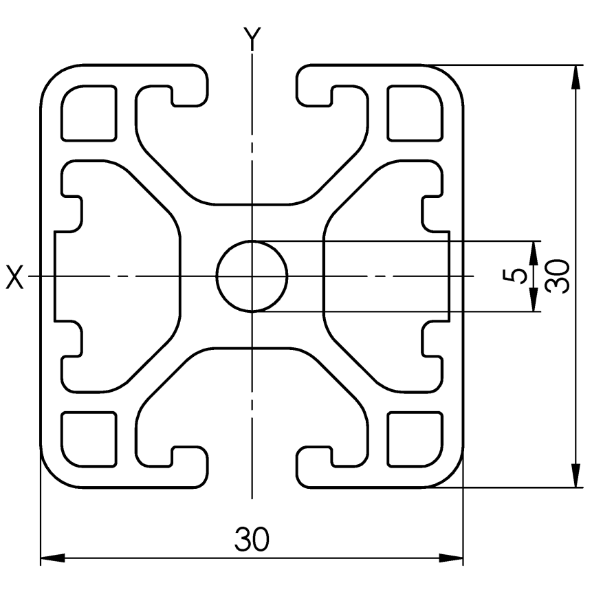 Profil aluminiu compatibil ITEM 30x30 Sistem 30 LIGHT Canal 6, inchis pe 2 laturi paralele